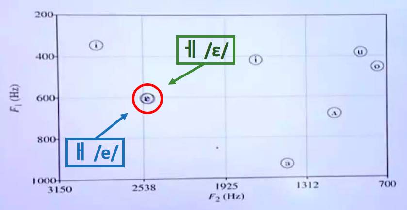 某机构用声学仪器测试了十几位韩语老师的发音图谱,并且根据声学参数将这些发音准确的标记了出来。我们可以看到这两个在韩语老师看来有差异的音在图谱实际上已经重合了。也就是说这两个元音在外部传输的衰减中已经分辨不出差异了。