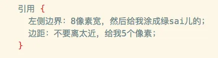 引用也是一个比较重要的排版,做好看了还是很有成就感的。一般来说,引用的部分,都会在前面留一个竖线,然后把字体颜色调整一下。写出来大概是这个样子。
