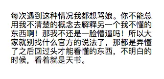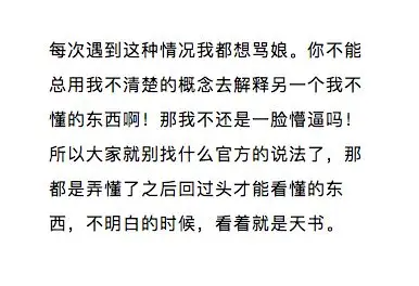 每次遇到这种情况我都想骂娘(“骂娘”加粗)。你不能总用我不清楚的概念去解释我不懂的东西啊!那我不还是一脸懵逼吗!(“…懵逼吗!”这句话字体为红色)所以大家就别找官方的什么说法了,那都是弄懂了之后回过头看才清楚的东西,不懂的时候,看着就是天书(“天书”这两个字用斜体)。