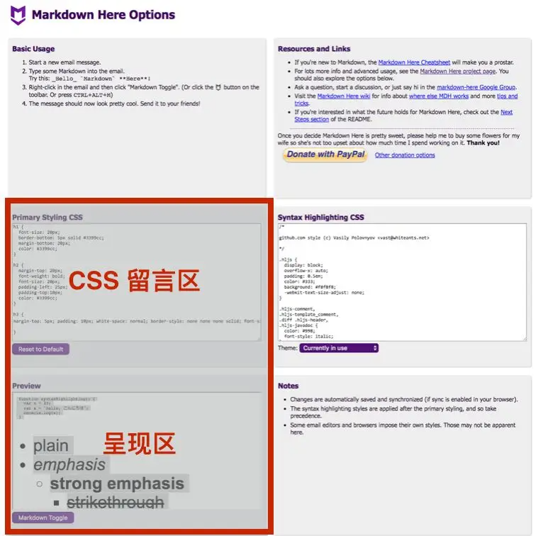 我们跳到下一个问题:这样的留言写好了之后,放在哪里呢?刚才说的markdown文章,你可以直接贴到相应发布平台的编辑器里,而刚才写好的CSS留言,你需要放到一个特定的位置,那就是Markdown-Here的设置栏。