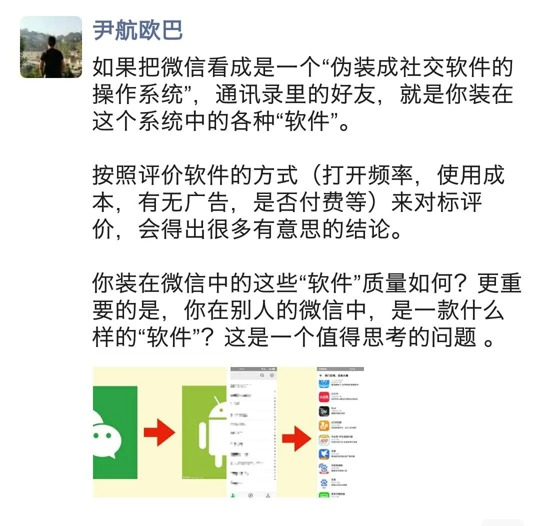 前两天发了一个朋友圈我们每个人其实都是一款软件,别人加你的微信,就是把你这款“软件”安装到自己的微信中。
