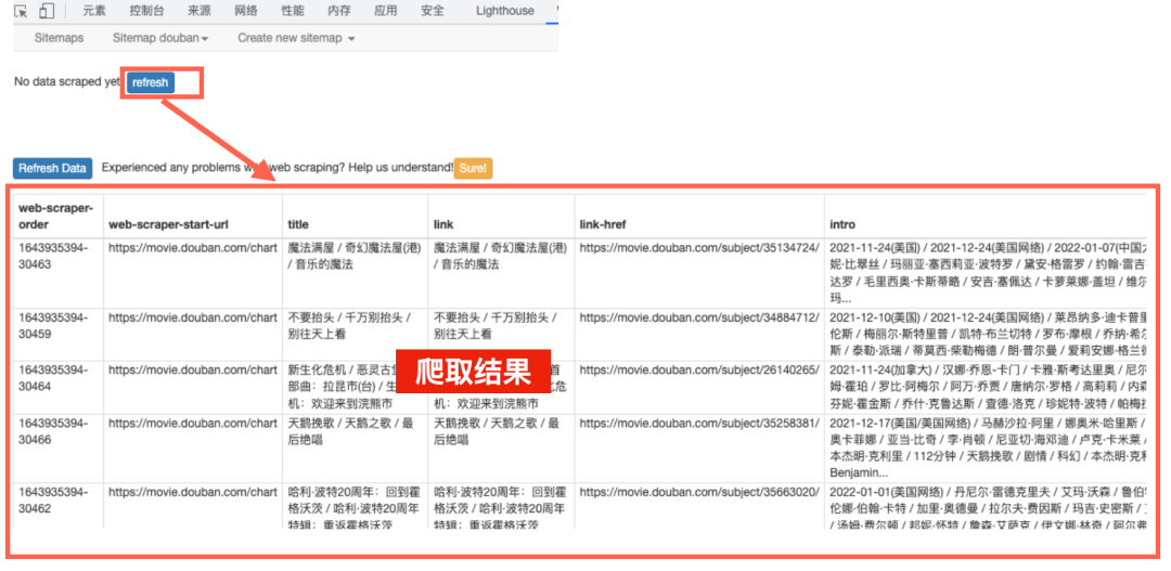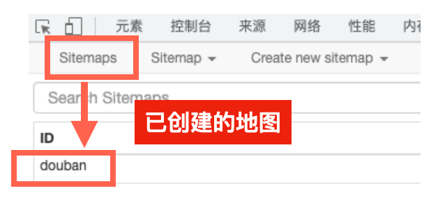 如果你在上篇教程中,已经创建好了针对“豆瓣电影排行榜”的网页地图,只需要在Web Scraper的主界面中,点击第一栏的“sitemaps”然后选择已创建的地图即可。