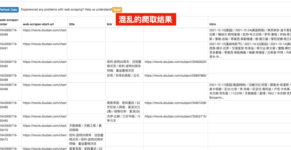 如果我们跳过了“选取重复单元”这一步,上来就直接选择标题,链接等具体数据,就会出现这样的情况。