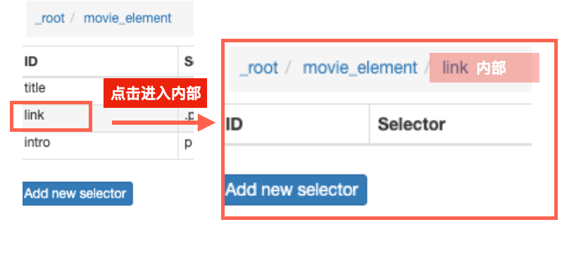 这时,就可以点击进入链接的“selector”当中,进一步指定爬取规则。