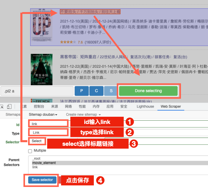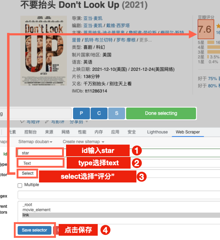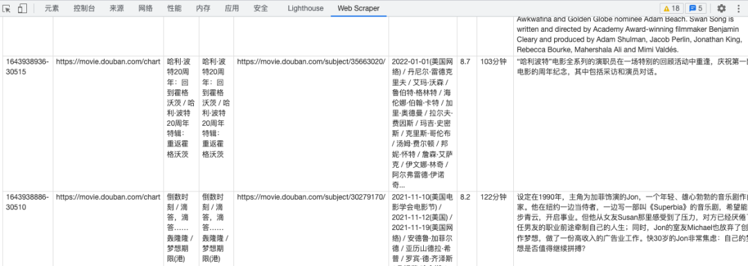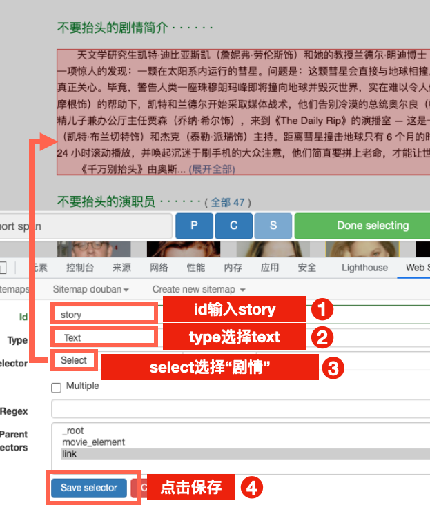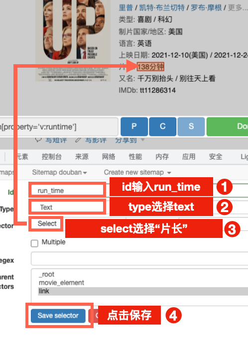 添加三个新的selector,分别爬取一下豆瓣评分,电影时长,剧情梗概。