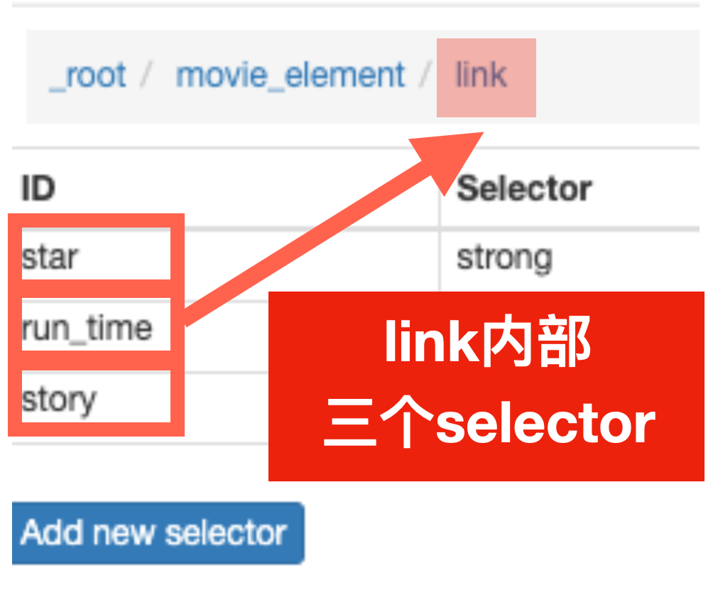 在我们刚才已经构件好的爬取规则中,有一个“链接”的selector,点击进入这个selector。