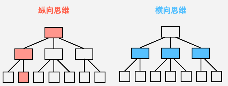 如果把我们的思维比作金字塔结构,那么纵向思维就是在这些路径中,通过因果关系的考察,找到一条尽可能纵向深入的路径。而横向思维是更加跳跃,希望能够寻找更多可能性的方法。