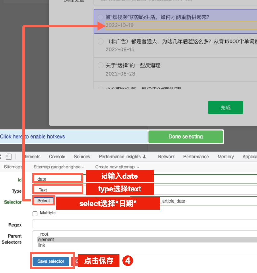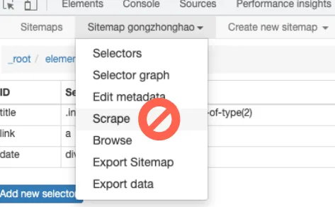 完成这些选取之后,就可以开始爬取了。不过这里不要去点击“Scrape”按钮,否则会失败。