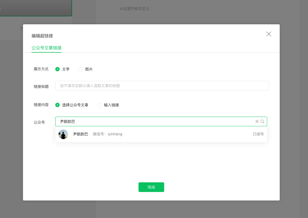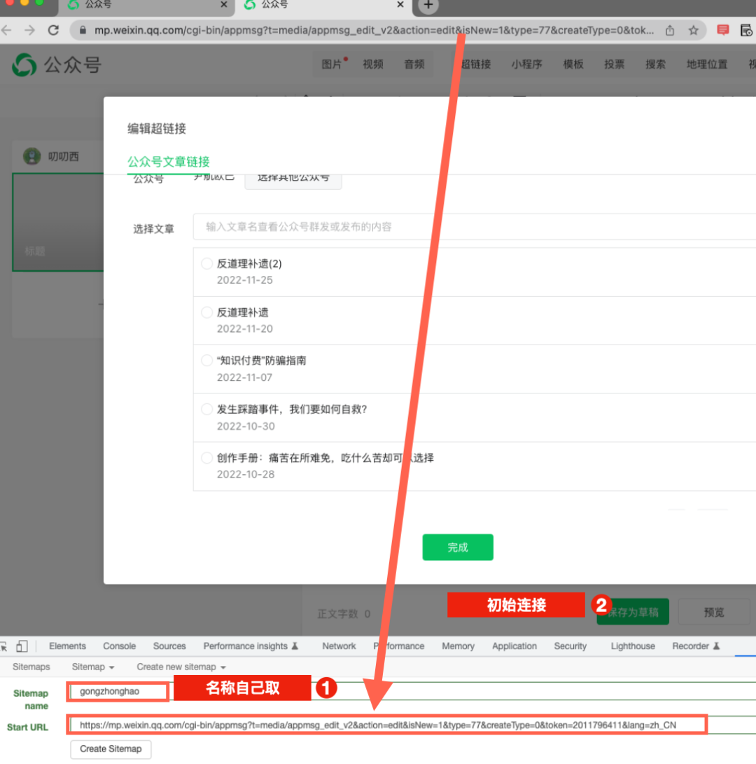 随后登录到自己的公众号后台,点击“新建文章”,点击工具栏当中的“超链接”,输入自己想爬取的公众号,找到文章页面,就可以从教程第一步开始操作了。