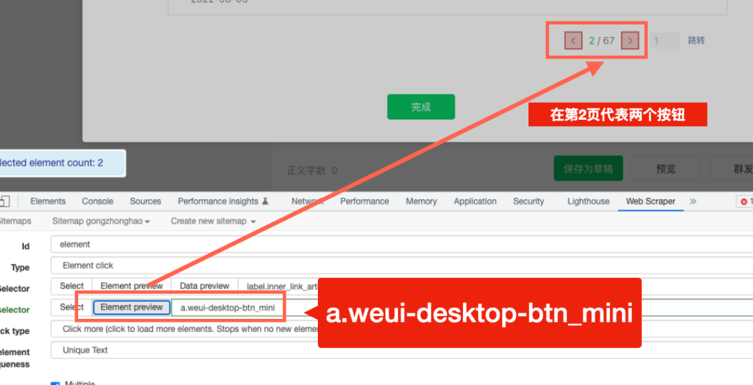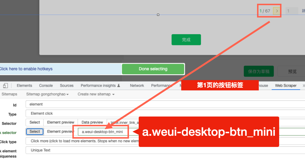 如果我们选中了“第一页”的按钮,它对应的标签是a.weui-desktop-btn_mini。