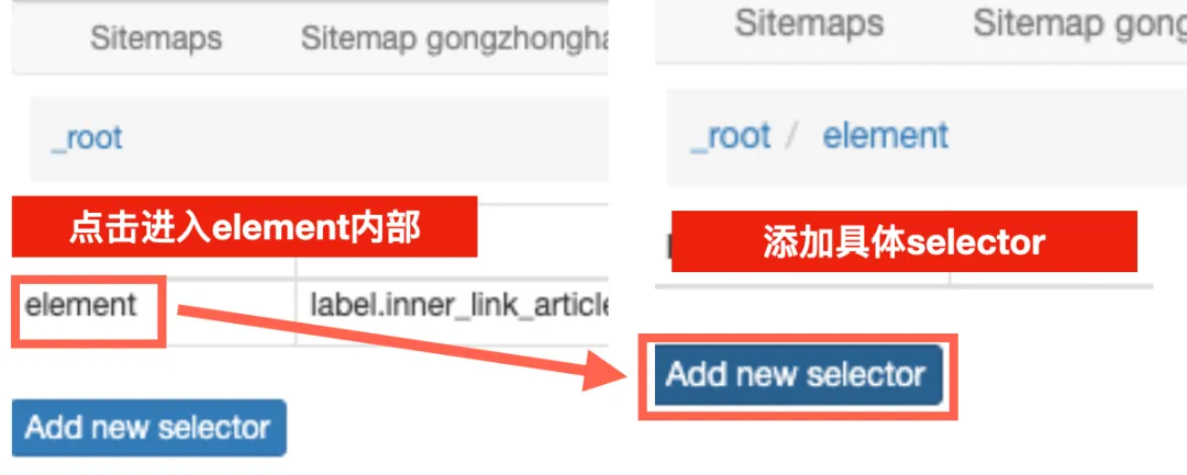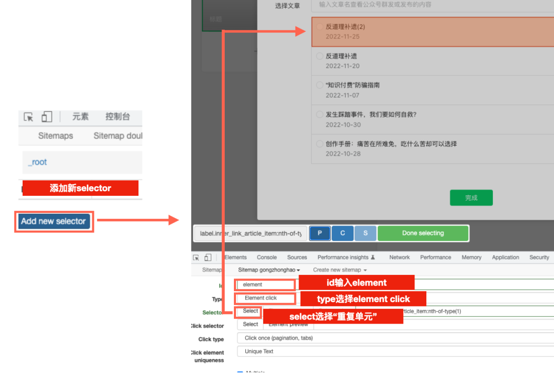 进入到主界面之后,首先建立一个selector,把所有的“重复单元”都选出来(尽量包含每个元素)。由于需要翻页,所以我们选择element click这个类型。