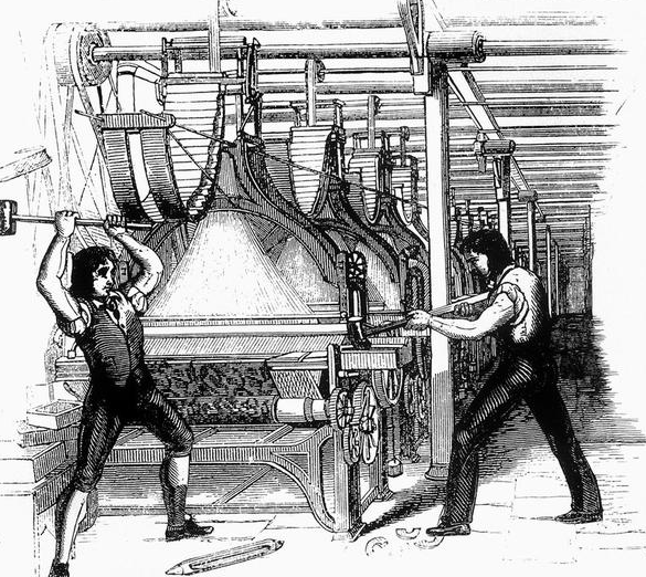 当年工业革命,机器生产逐渐替代了手工生产,导致很多手工业者失业,工人工资下跌。所以很多人把机器视为贫困的根源,用破坏机器的方式,来反对企业主。