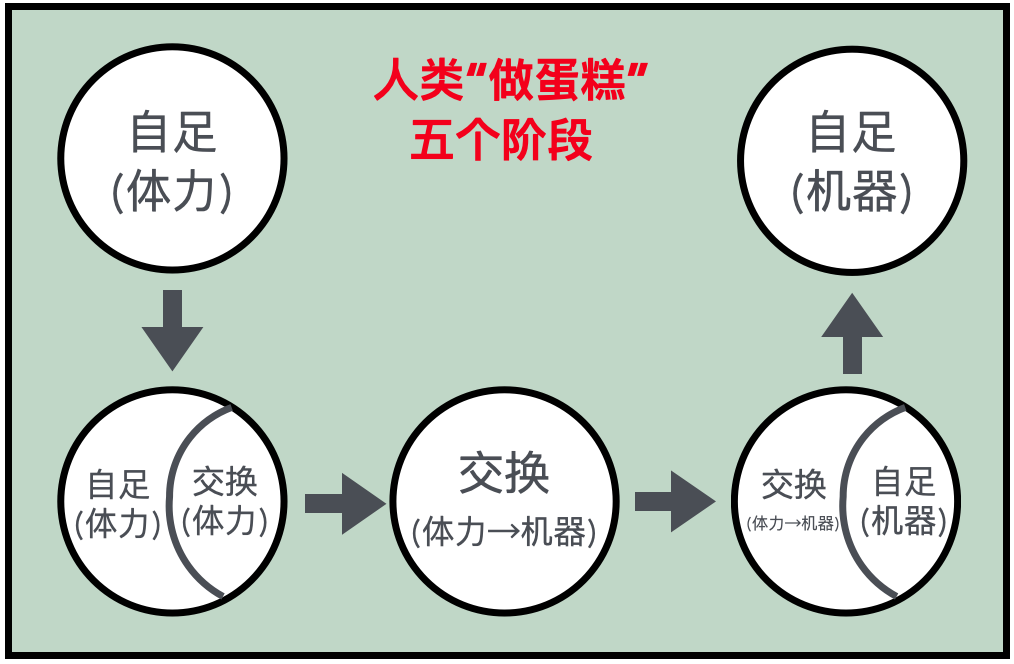 交换体系成熟,人们逐渐放弃“自给自足”,转而进行分工。效率进一步提升,蛋糕做的更大。