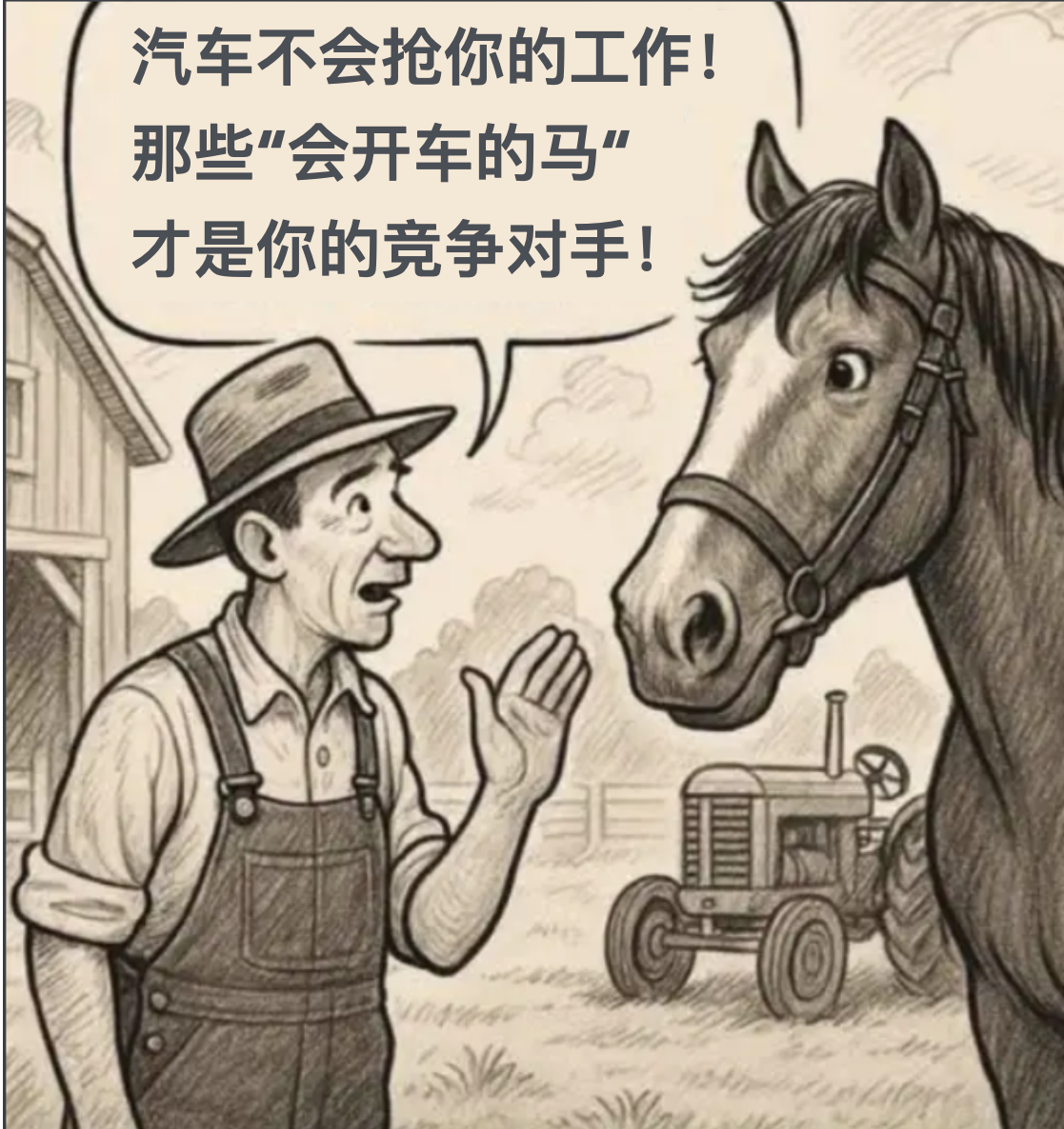 漫画里的马没有意识到,汽车想替换的不只是“马车”,而是“马车+马”。